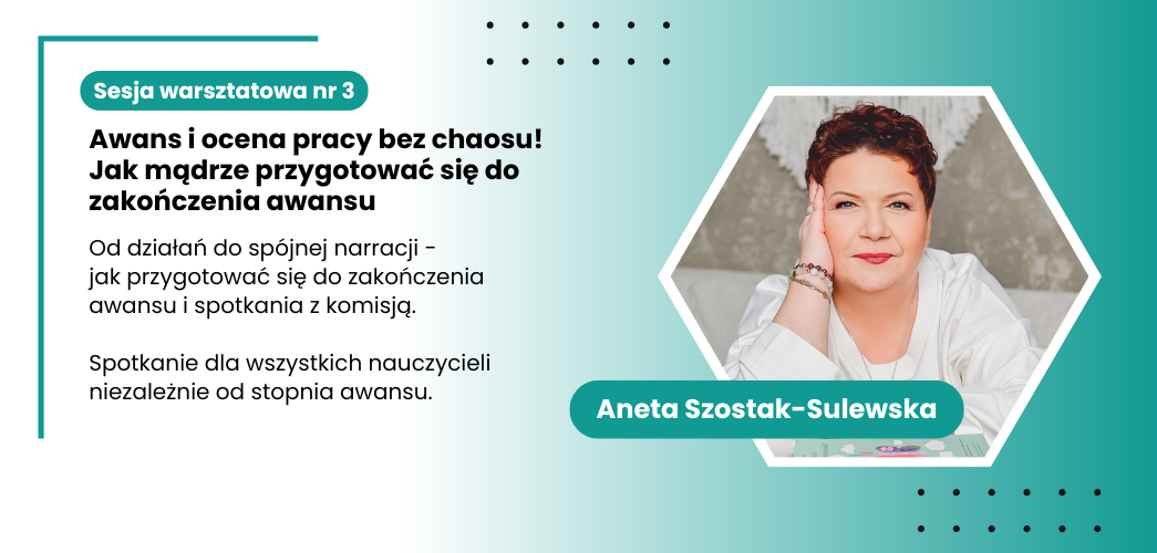 Warsztat nr 3: Aneta Szostak-Sulewska Od działań do spójnej narracji – jak przygotować się do zakończenia awansu i spotkania z komisją. Spotkanie dla wszystkich nauczycieli – niezależnie od stopnia awansu. ( 50 miejsc)