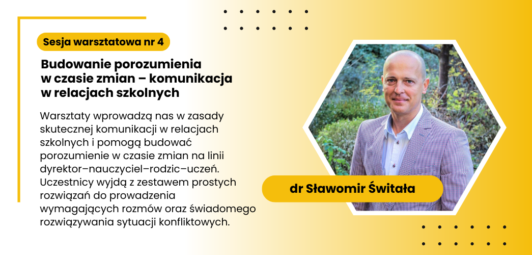 Warsztat nr 4: Sławomir Świtała Budowanie porozumienia w czasie zmian – komunikacja w relacjach szkolnych ( 25 miejsc)