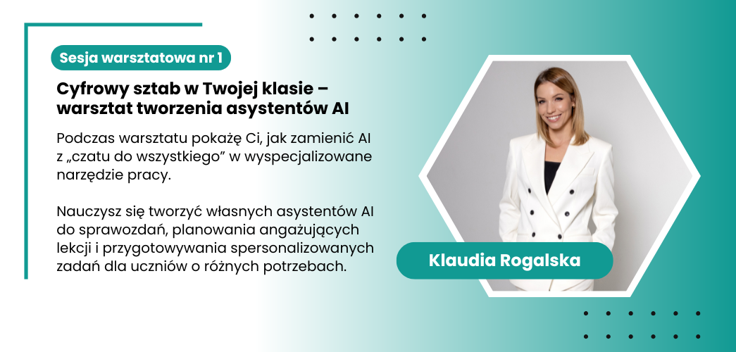 Warsztat nr 1: Klaudia Rogalska-Kalota – Cyfrowy sztab w Twojej klasie – warsztat tworzenia asystentów AI ( 50 miejsc)